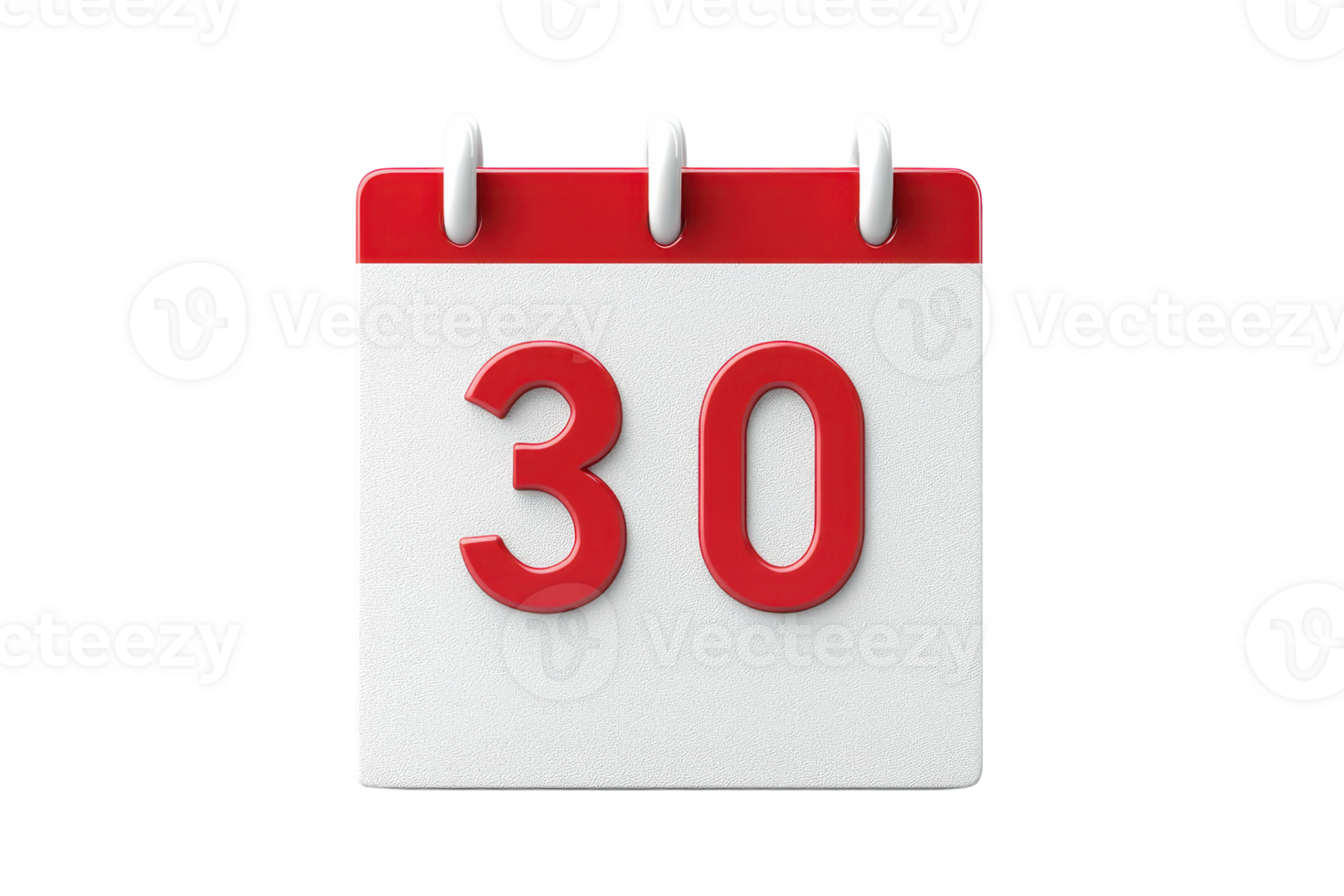 A digital image of a calendar icon displaying the number 30, with a red border and transparent background. symbolizing a date or event. Pro PNG