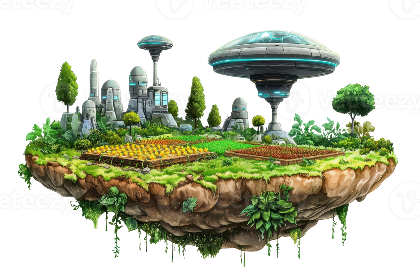Futuristic floating island with advanced architecture, lush greenery, and sustainable agriculture in a utopian sci-fi setting. Pro PNG
