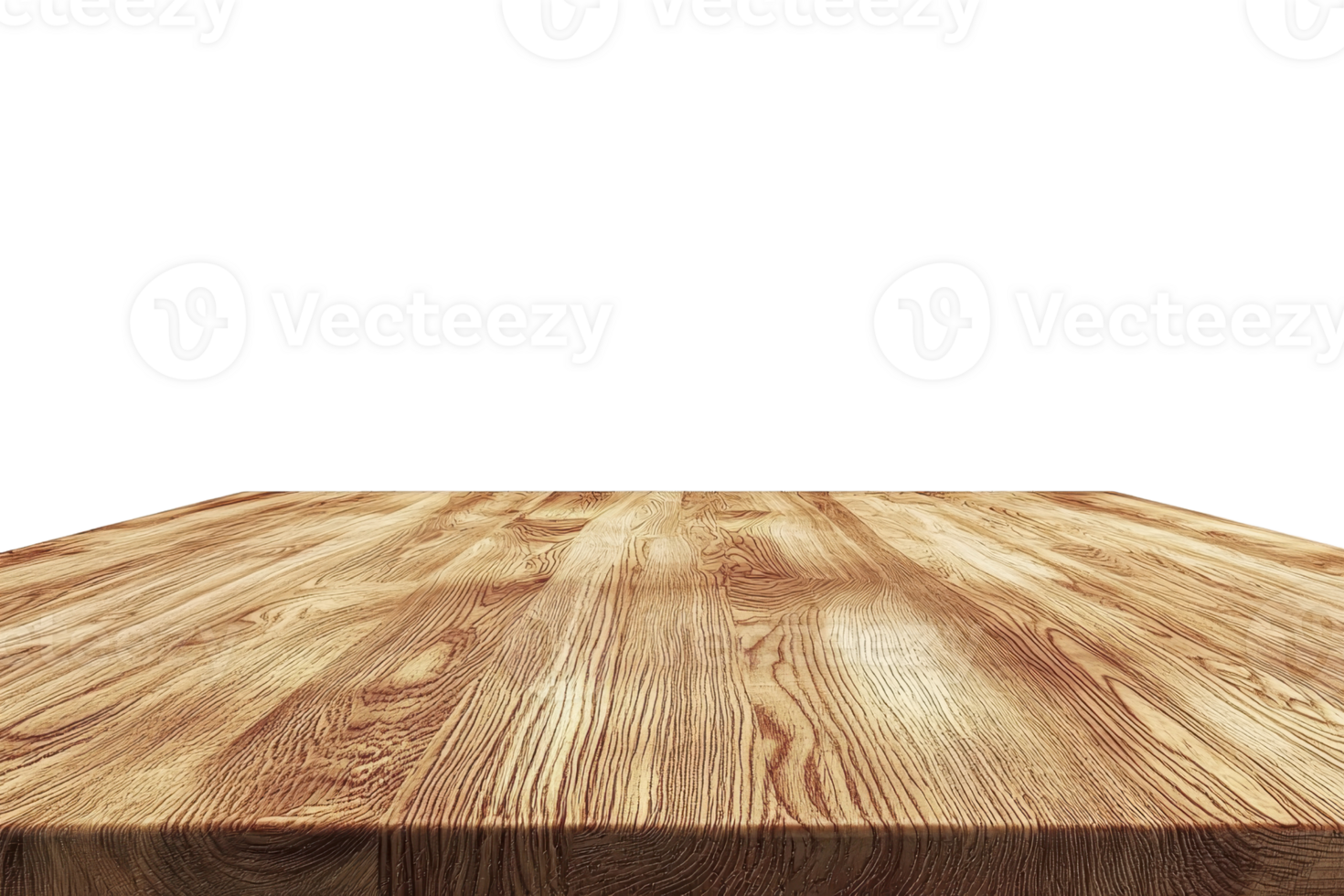 A wooden table surface viewed from a low angle, set against a transparent background, highlighting its texture and natural patterns. Pro PNG