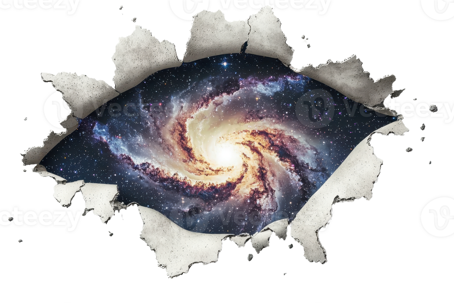A swirling galaxy is depicted as if viewed through a large tear in a surface, creating an illusion of depth and cosmic wonder. Pro PNG