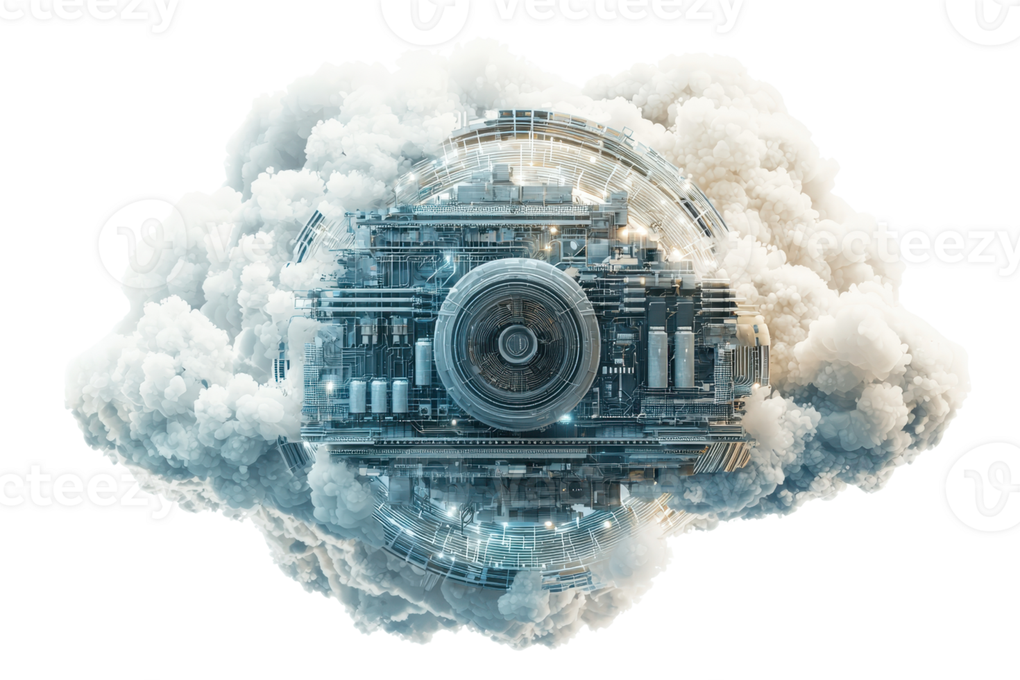 A futuristic mechanical device embedded within a fluffy cloud, showcasing intricate details and a synthesis of technology and nature. Pro PNG