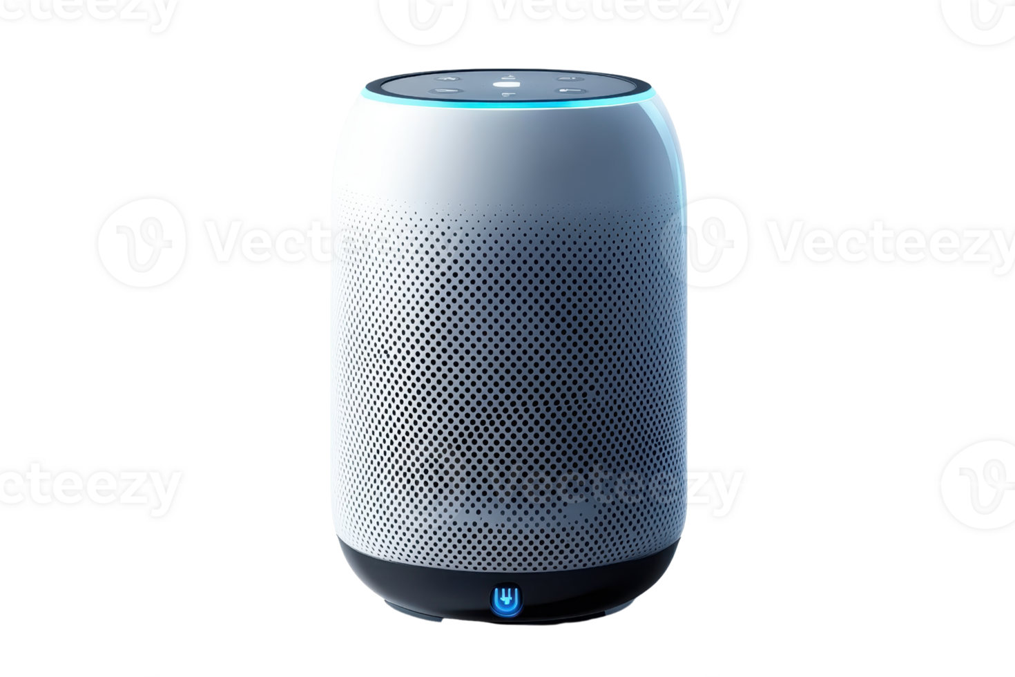Smart speaker with a sleek design featuring a mesh grille and illuminated top panel for interactive controls. Pro PNG