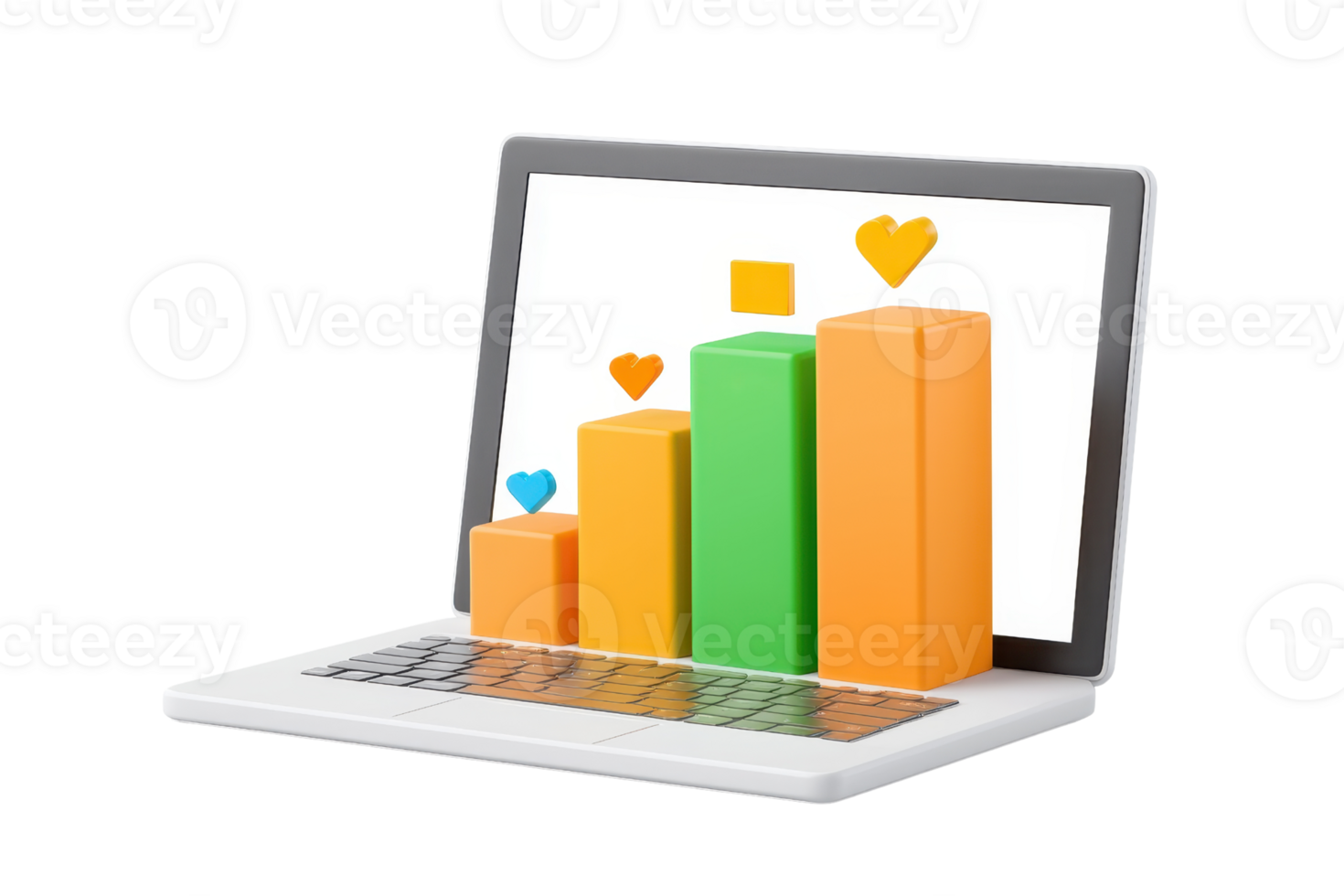 A laptop displaying colorful bar graphs and heart icons, representing data growth and positive metrics. Pro PNG