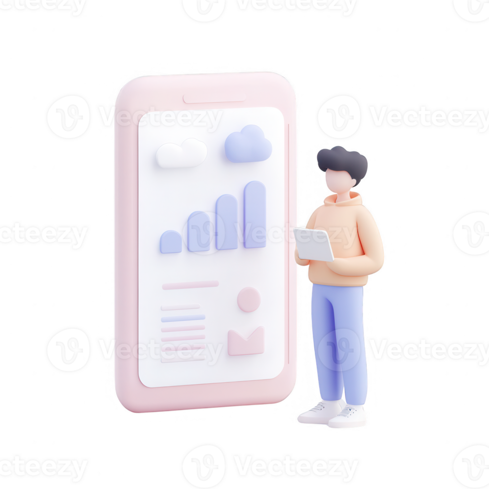 A character analyzing data on a smartphone with colorful graphs and icons. Pro PNG