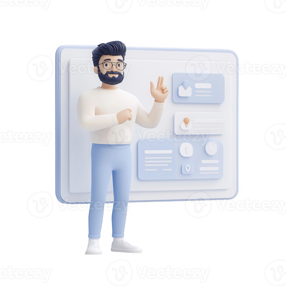 A 3D character presenting data with a digital interface background. Pro PNG
