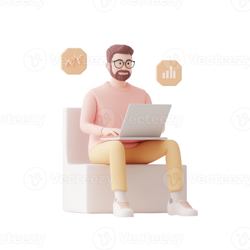 A man working on a laptop analyzing data with charts and graphs in a modern setting. Pro PNG