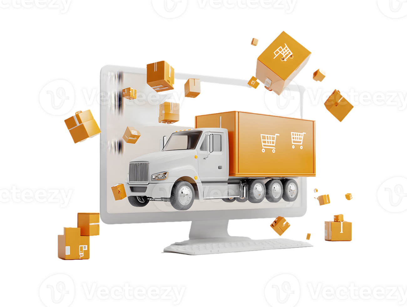 Digital representation of a delivery truck emerging from a computer monitor surrounded by floating boxes symbolizing modern logistics and e-commerce solutions Pro PNG