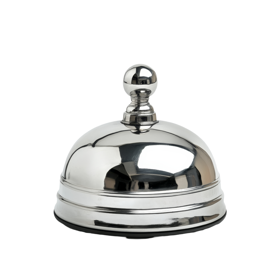 A shiny silver desk bell placed on a clean transparent surface for signaling attention in a professional setting, image of a silver desk bell on a transparent background or transparent background with a Free PNG