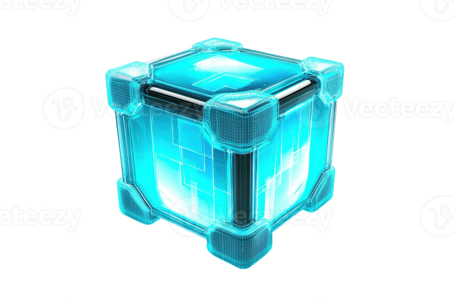 A glowing, futuristic blue cube with hexagonal edges and illuminated patterns. Pro PNG