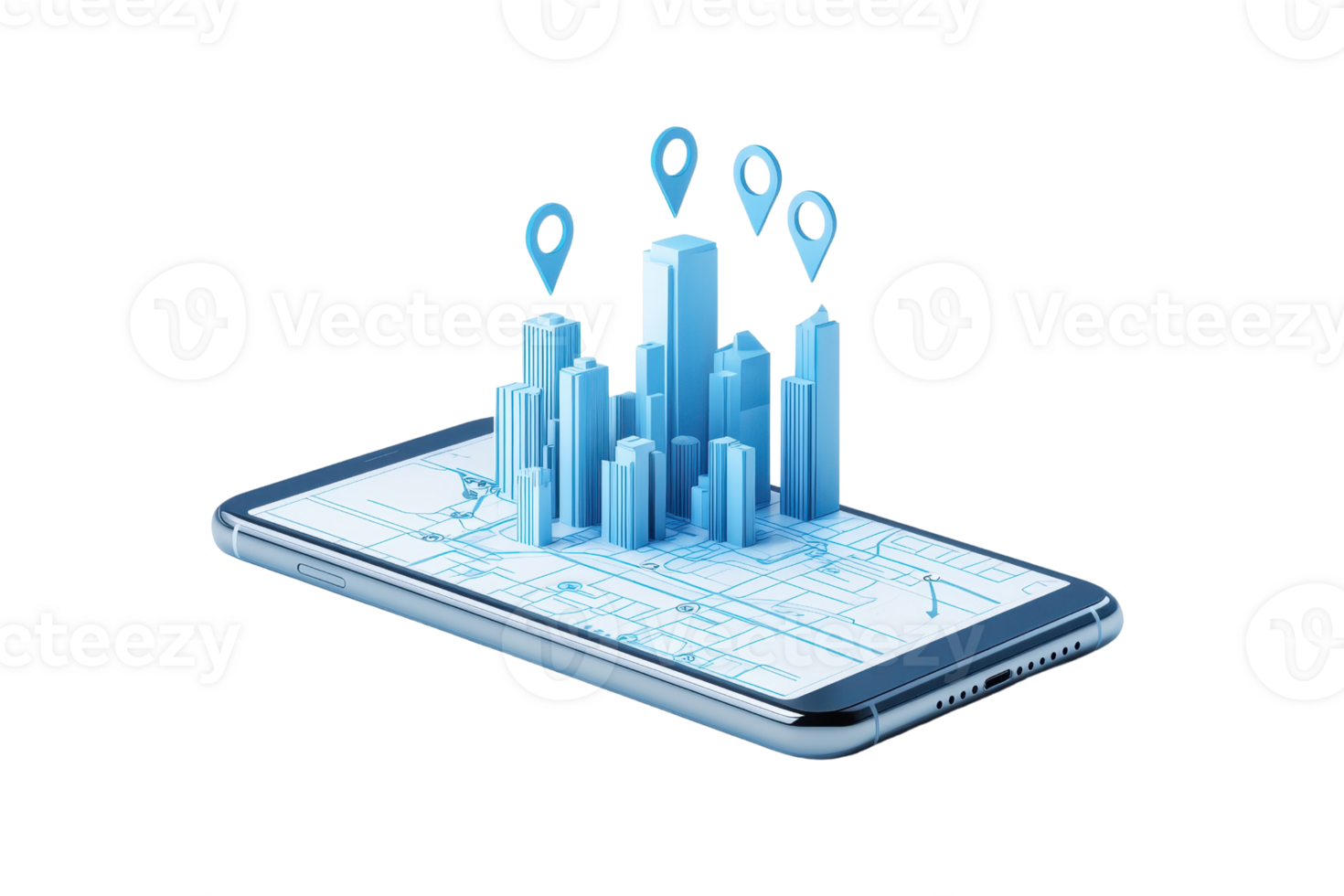 A smartphone displays a 3D cityscape with multiple location markers, emphasizing urban navigation and mapping technology. Pro PNG