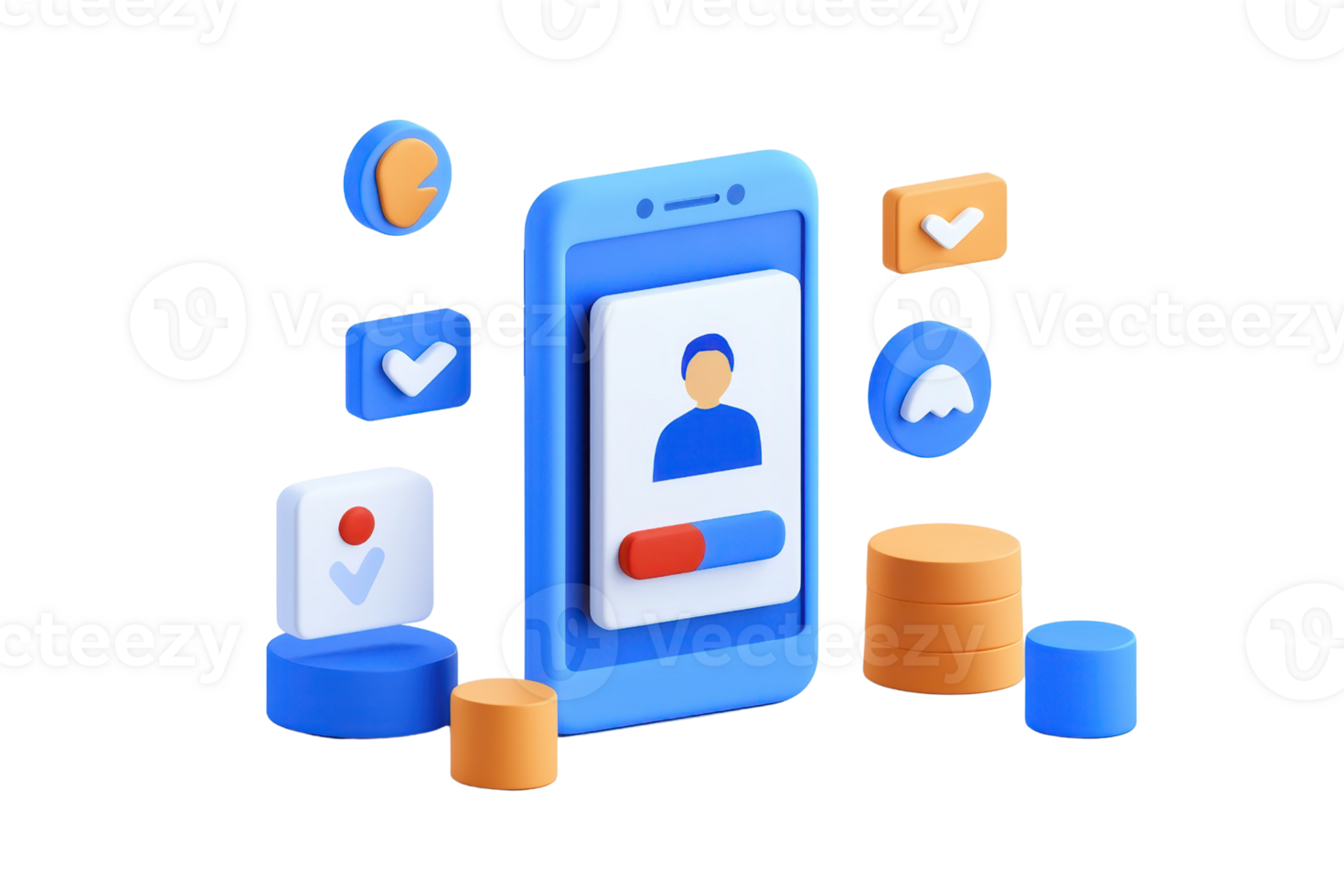 A smartphone displaying a user profile surrounded by various icons and circular elements representing data and interaction. Pro PNG