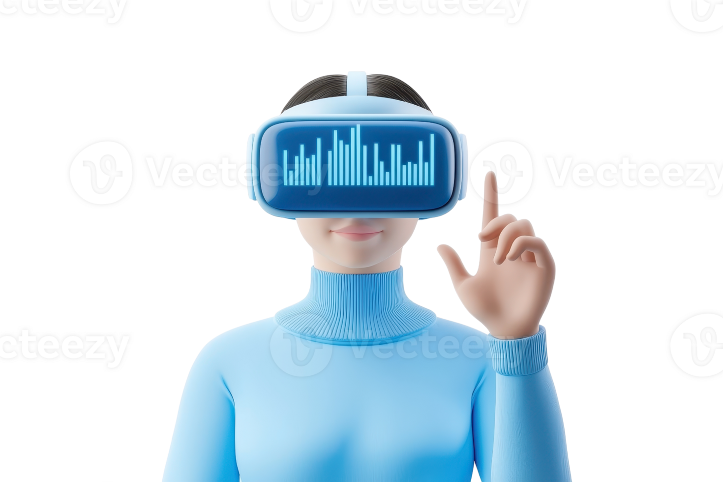 A person wearing a virtual reality headset, gesturing with one hand while displaying graphical data on the headset screen. Pro PNG