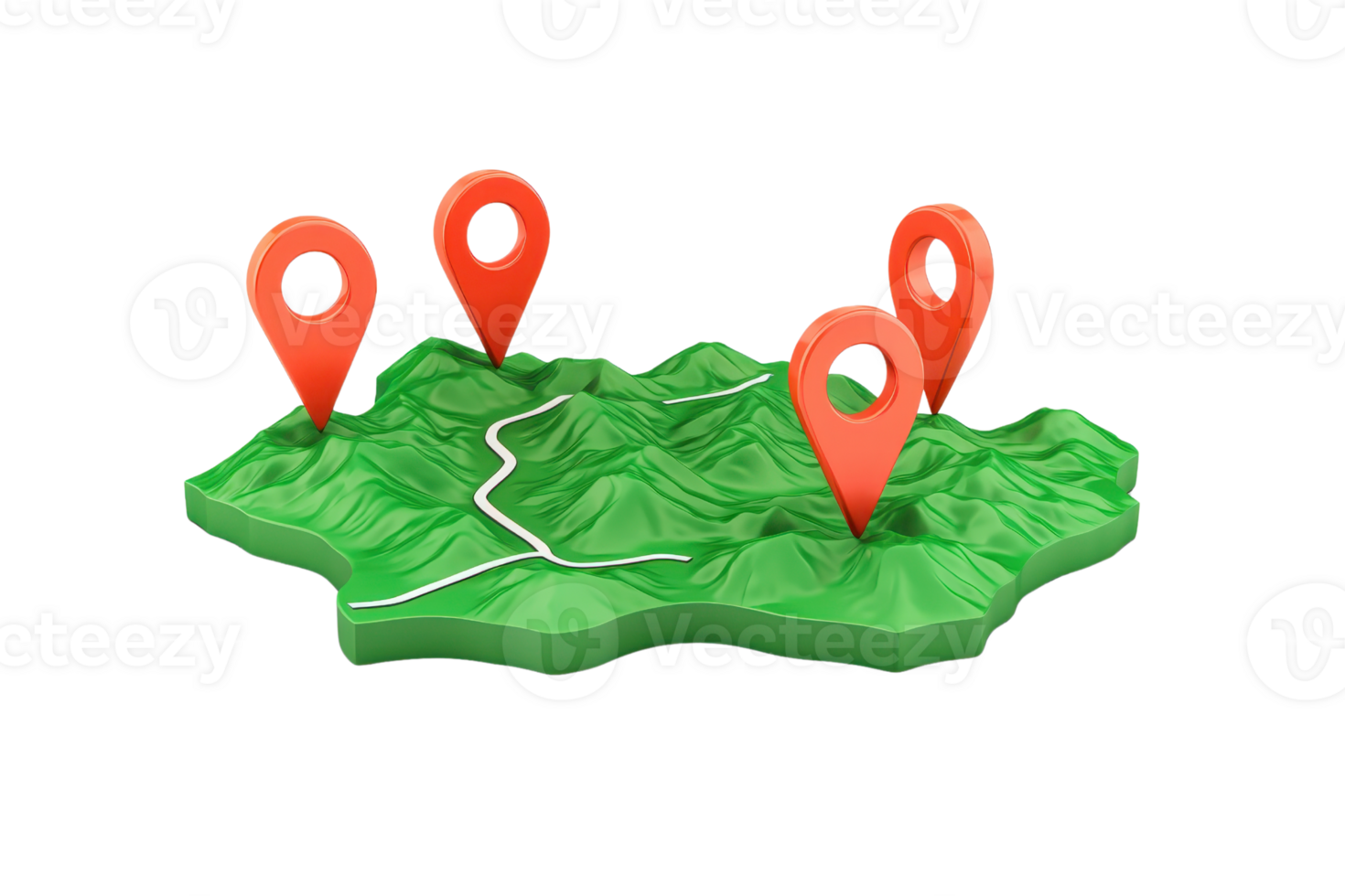 A 3D topographic map featuring multiple red location pins, highlighting specific points of interest on a textured green landscape. Pro PNG