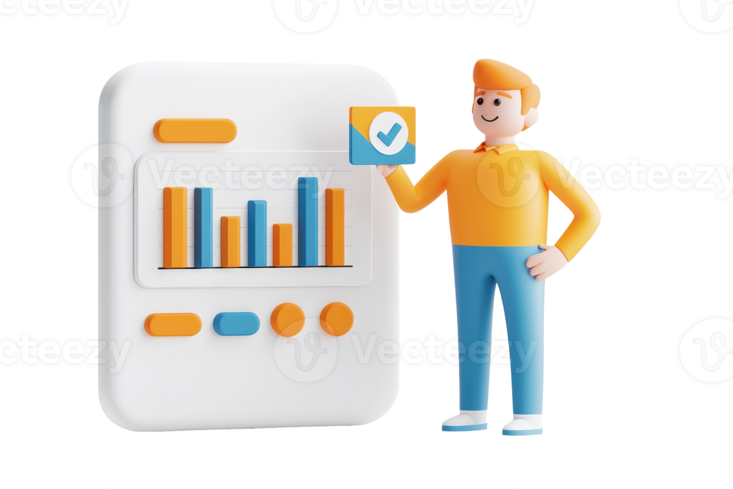 A stylized figure presents data on a digital display featuring colorful bar charts and an envelope icon. Pro PNG