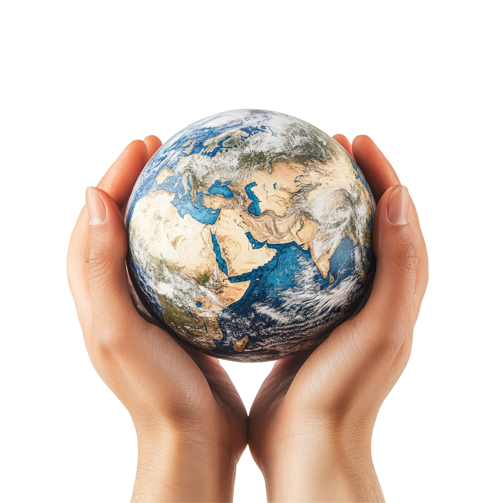Hands cradling a globe symbolizing global unity and environmental stewardship on a transparent background, earth globe on palm hands isolated on transparent background png