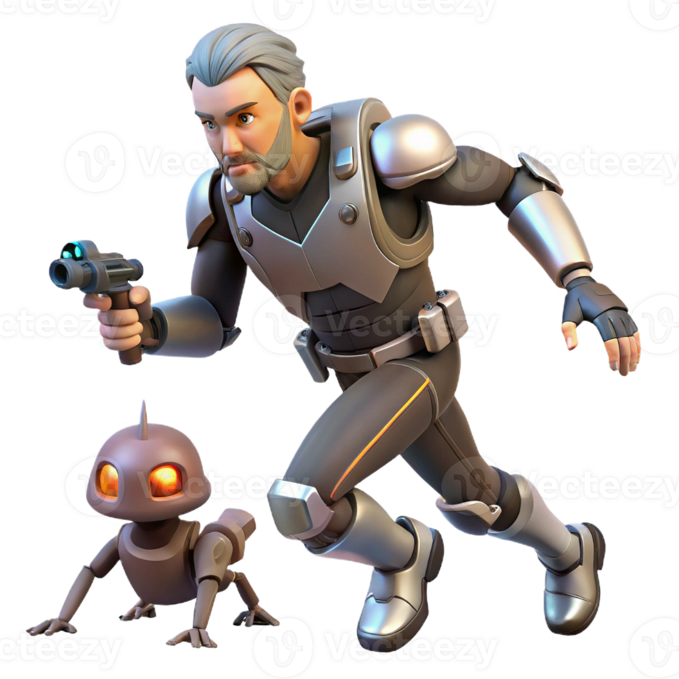 Agent Robot Futuristic Action A thrilling 3D render of an agent and robot engaged in futuristic action, blending technology with adventure. Pro PNG