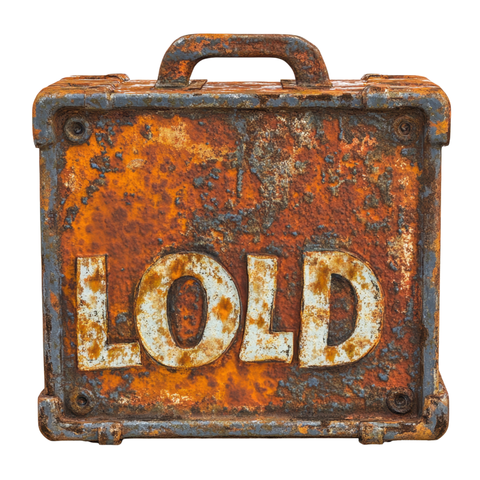 Weathered rusty container with the word load visible on a textured surface, rusty container with the word load written on it, Transparent background png
