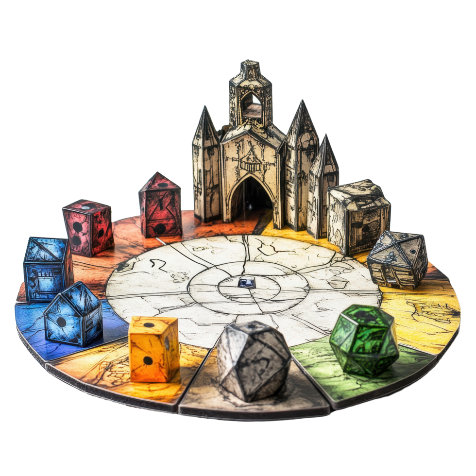 Engaging RPG board game setup with colorful dice on a detailed game board, RPG board game, Transparent background Free PNG