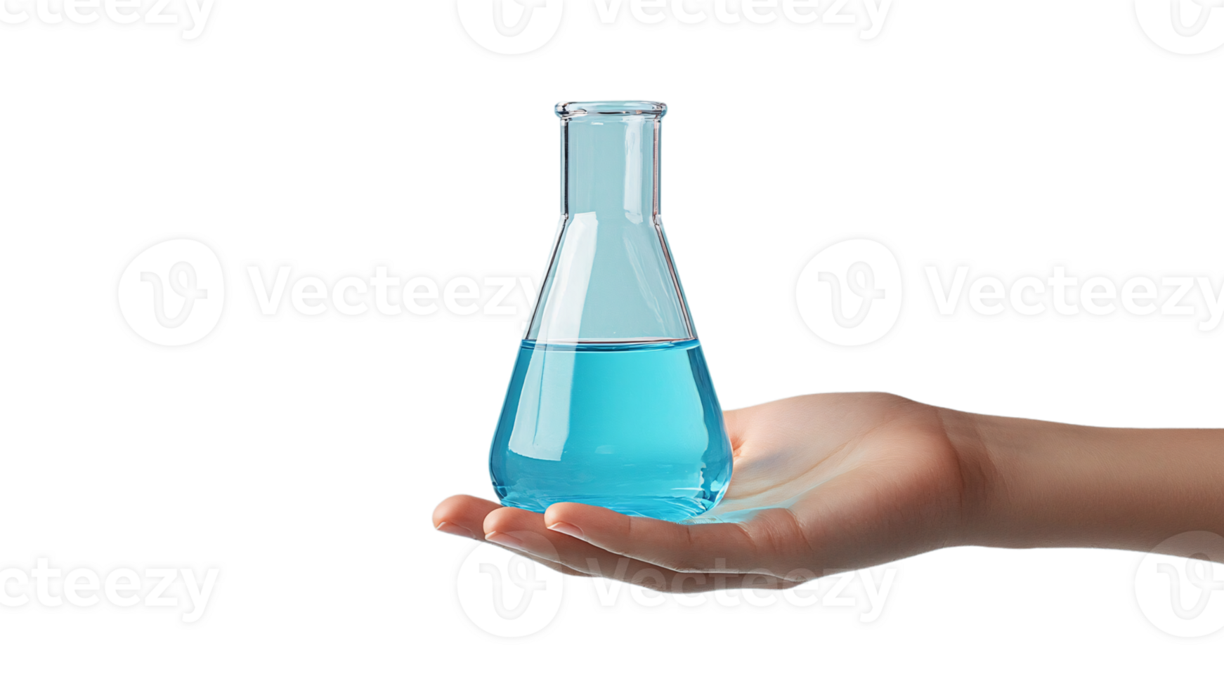 The hand holds a conical flask with blue liquid, emphasizing control, precision, and an experimental approach in a minimalist setting Pro PNG