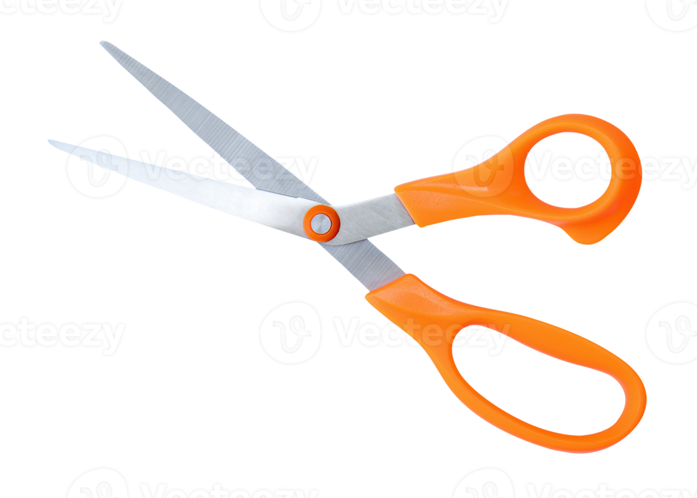 Inclined medium open multipurpose scissors with orange handle isolated with clipping path in file format Pro PNG