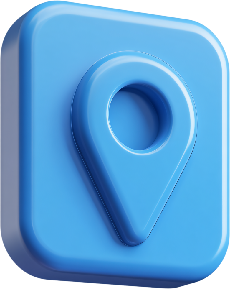 3D rendering of a blue location pin icon inside of a rounded square, often used to indicate geographical location or marker in a digital space. Free PNG