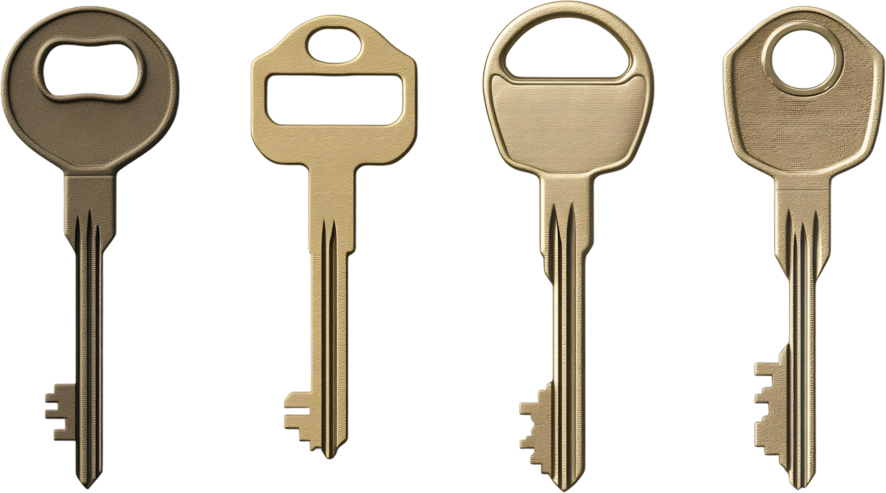 A line-up of metal keys, each with a unique top shape, gleams against a stark black backdrop, representing security and access solutions. Free PNG