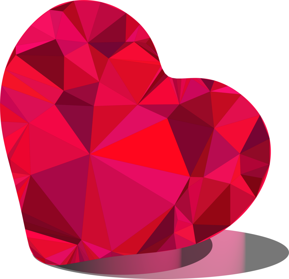 Geometric heart. Faceted gemstone. Ruby red tones. Triangular pattern. Crystal structure. Sharp edges. Light reflection. Dark shadow. Isolated. Free PNG