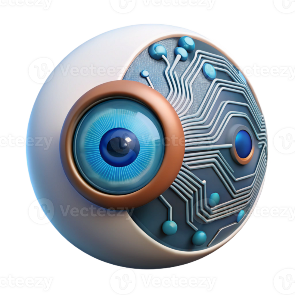 magnificent minimalist beautiful contemporary A close up of a bionic eye, its iris a complex network of glowing circuits, reflecting a binary code stream, illuminated by a sharp, focused white... Pro PNG