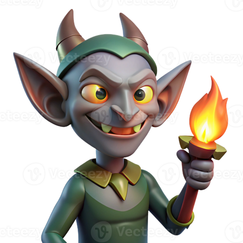 wonderful artistic A mischievous imp with pointed ears and a wicked grin, holding a flaming torch, illuminated by the flickering light of the torch. Grotesque style genuine Pro PNG