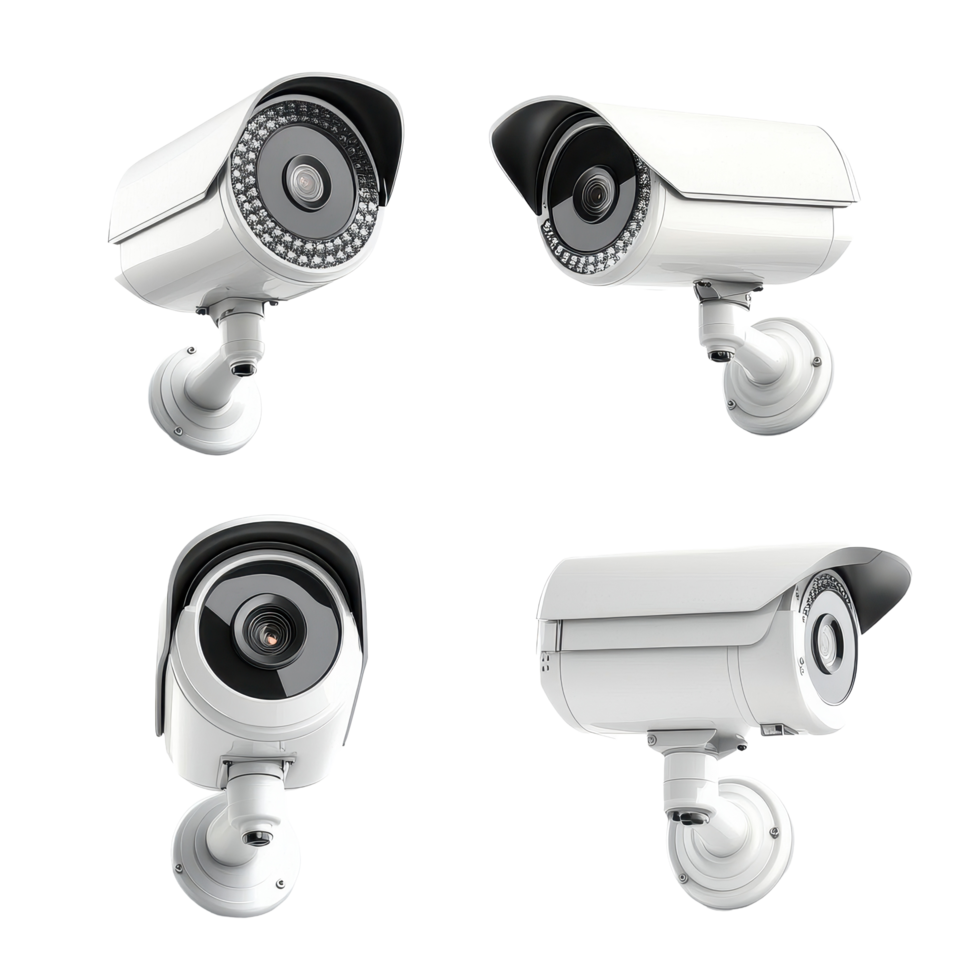 Security cameras mounted at various angles for monitoring purposes in a clean setting, Security Cameras in Different Angles on Transparent background Free PNG