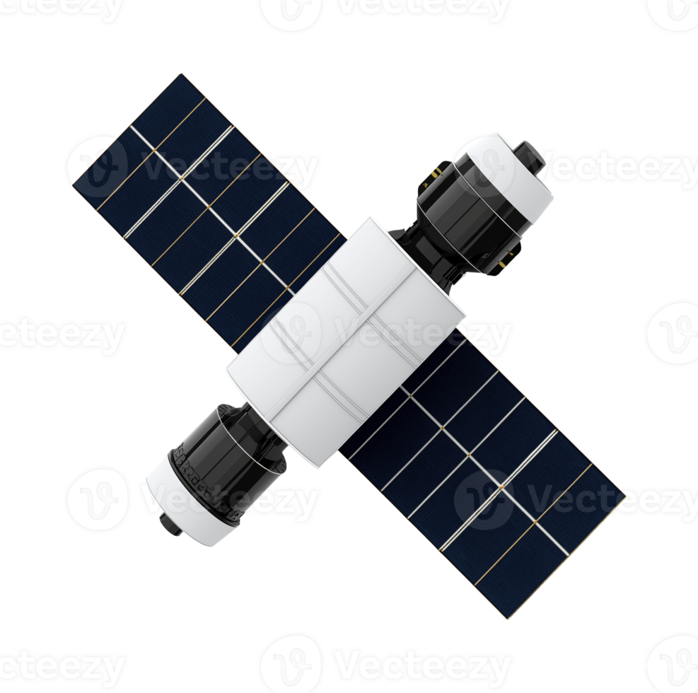 Modern satellite with solar panels floating in space image isolated transparent. Global technology cut out photo . Data transmission. Hightech device cutout element object photography Pro PNG