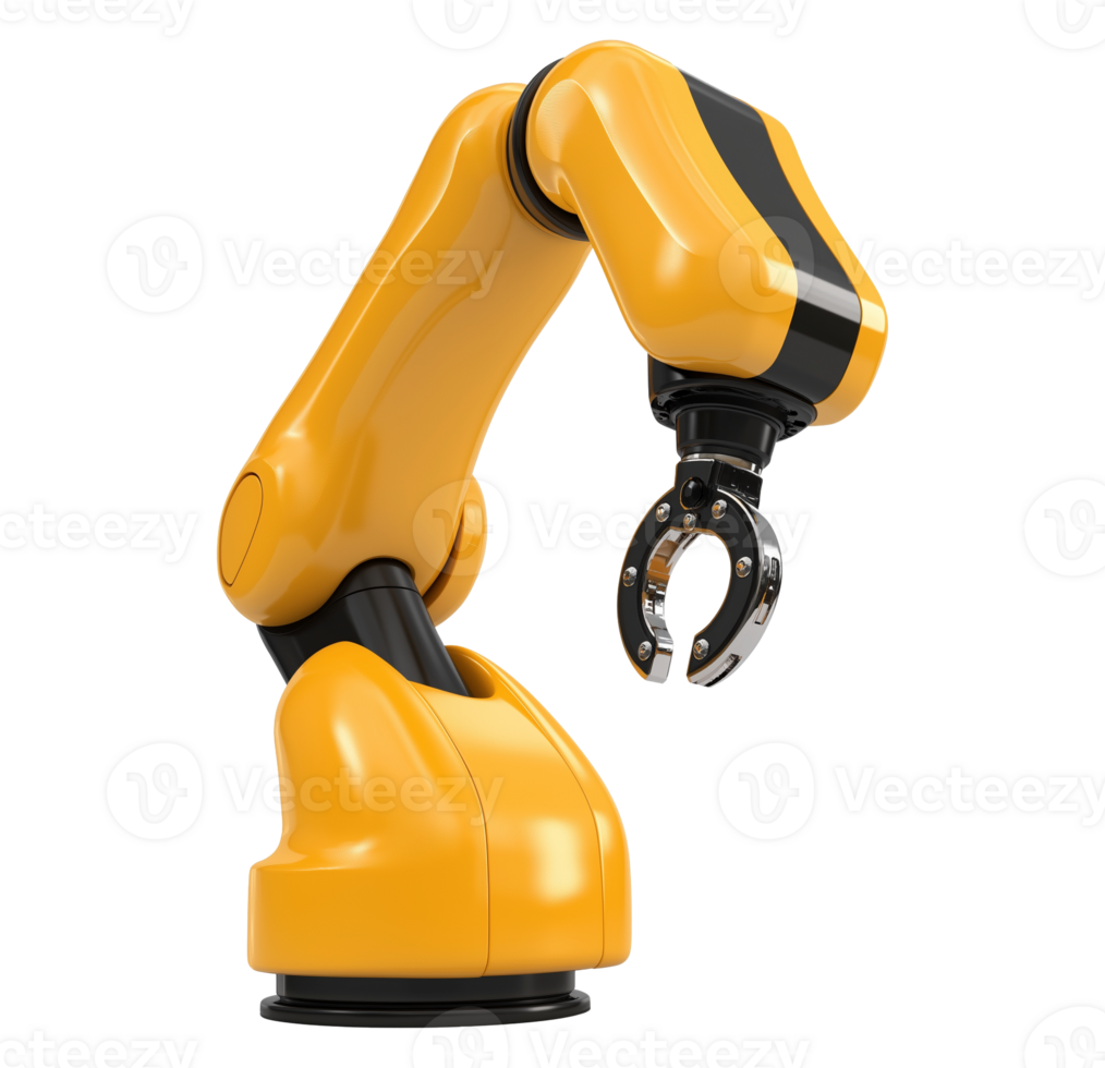 Yellow industrial robotic arm with gripper image isolated transparent. Manufacturing automation. Automated factory precision robot cutout element object photography Pro PNG