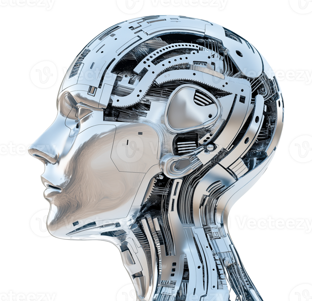 Futuristic cybernetic human head with mechanical components image isolated transparent. Machine intelligence cut out. Robotics engineering cutout element object photography Pro PNG