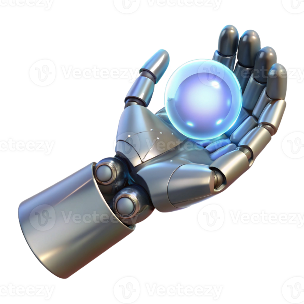 serene rustic A sleek, silver robotic hand gently holding a glowing orb of data, illuminated by soft, directional light from above, cyberpunk style premium Pro PNG
