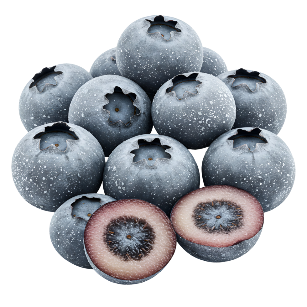 Arrangement of blueberries with a few sliced open showing the inside on a plain setting transparent background png