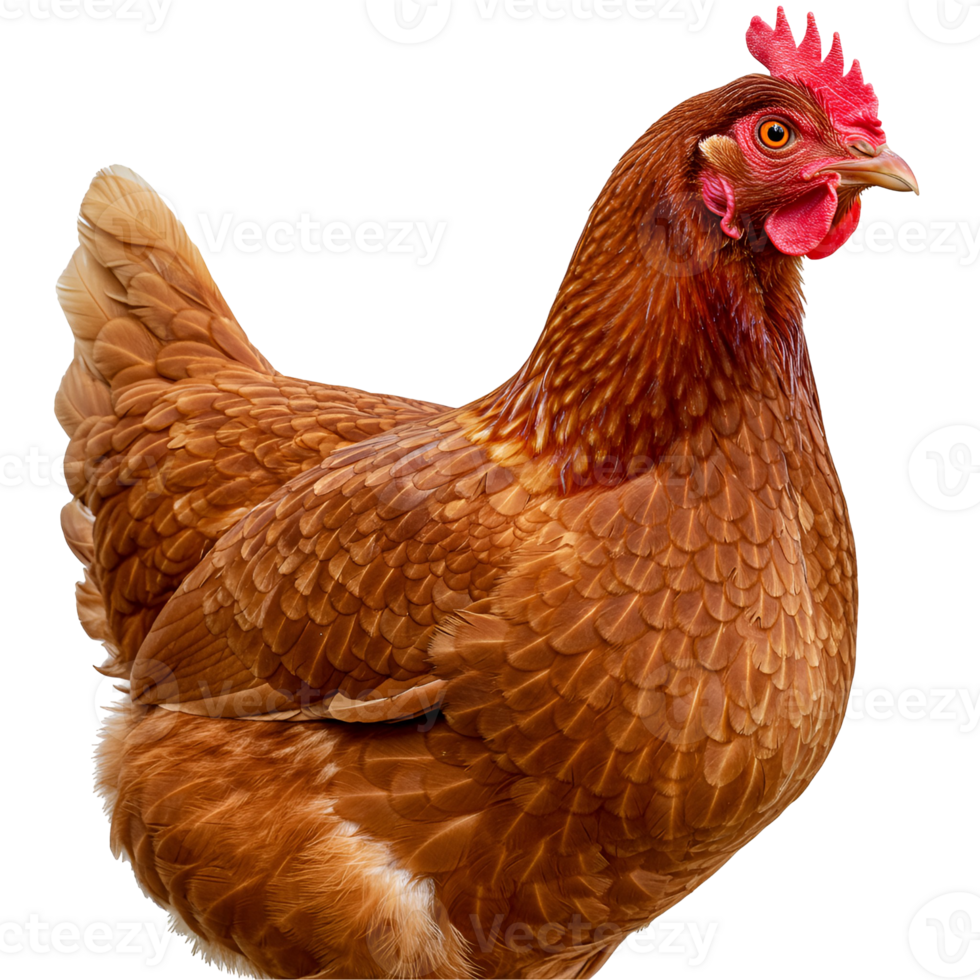 A reddish brown hen with a red comb and wattle in a profile view looking to the right side frame transparent background Pro PNG