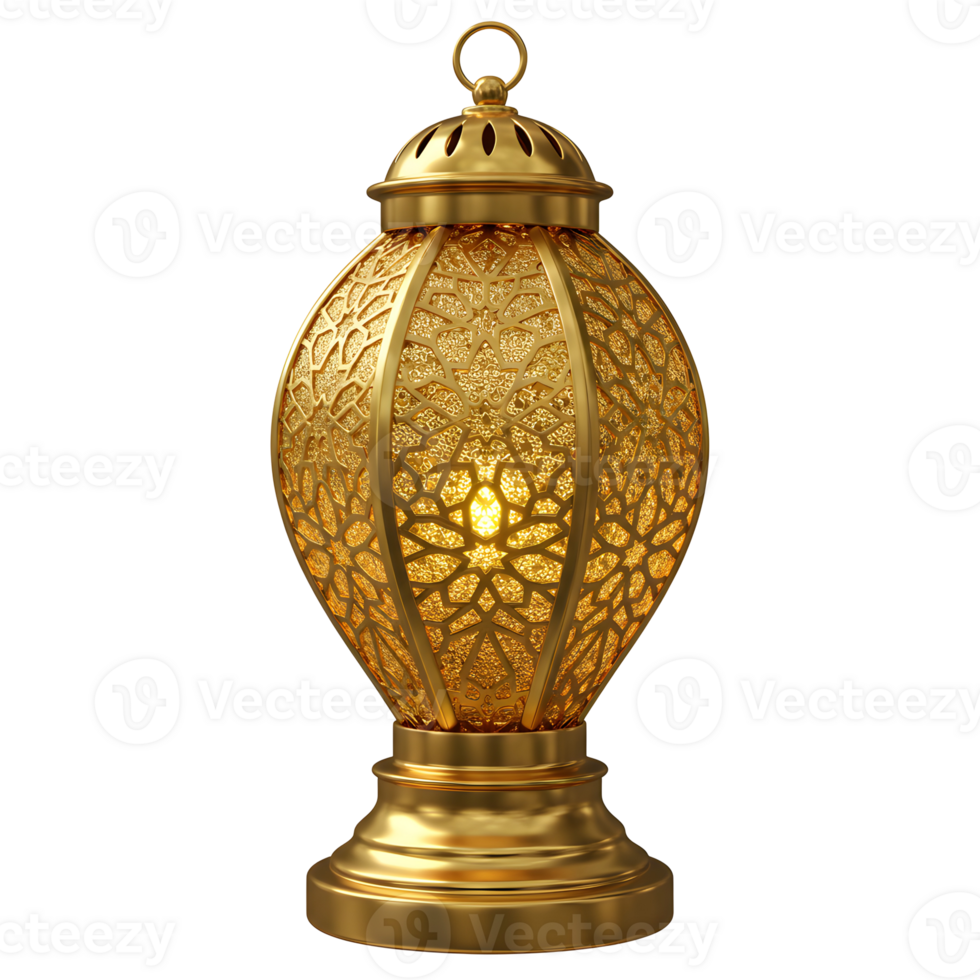 Ornate golden lantern with intricate designs casting a warm glow on a neutral setting view from front transparent background Pro PNG