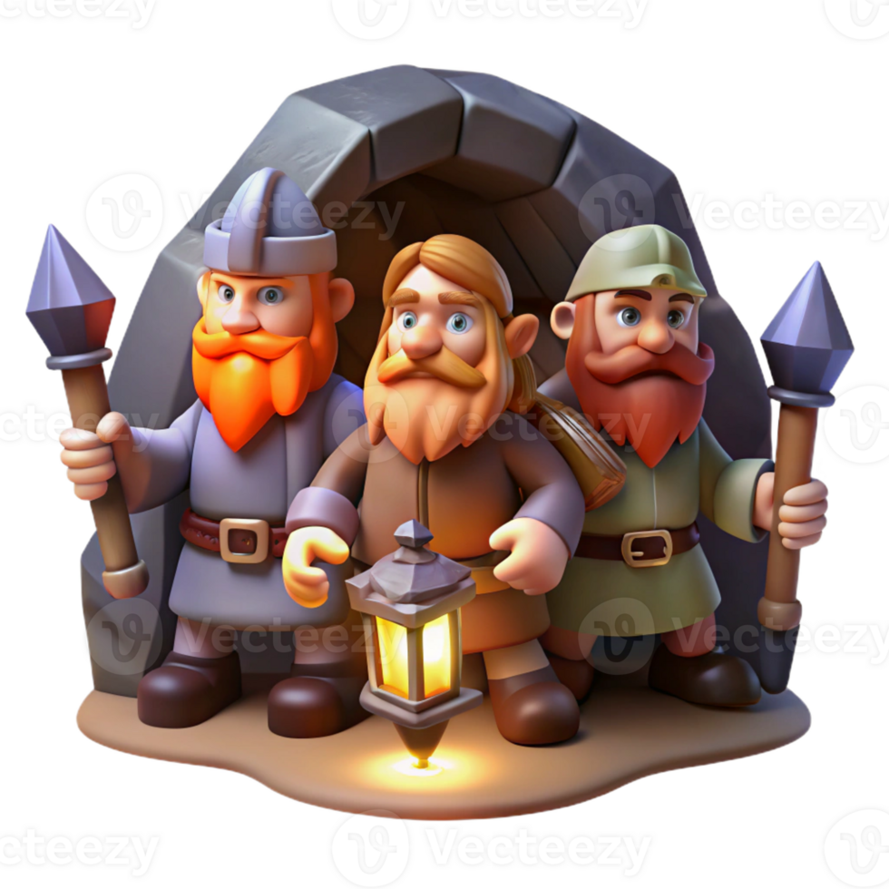 magnificent minimalist A group of adventurous dwarves with beards and axes, exploring a dark cave, illuminated by the light of their lanterns. Art style classic dwarven art high resolution Pro PNG