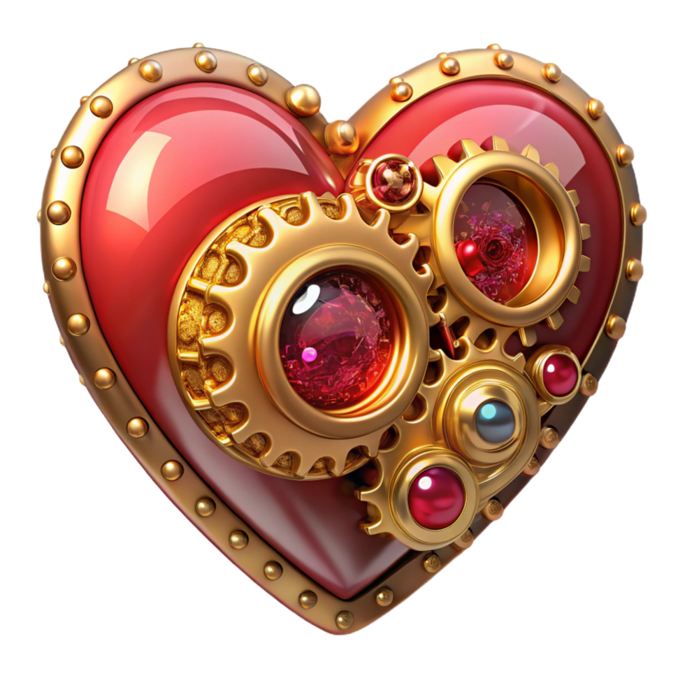 dynamic captivating Steampunk clockwork heart with ruby gemstones and gold filigree. NO BACKGROUND with Transparent Background. fine detail Free PNG
