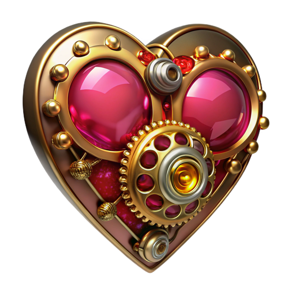 extraordinary notable Steampunk clockwork heart with ruby gemstones and gold filigree. NO BACKGROUND with Transparent Background. Free PNG