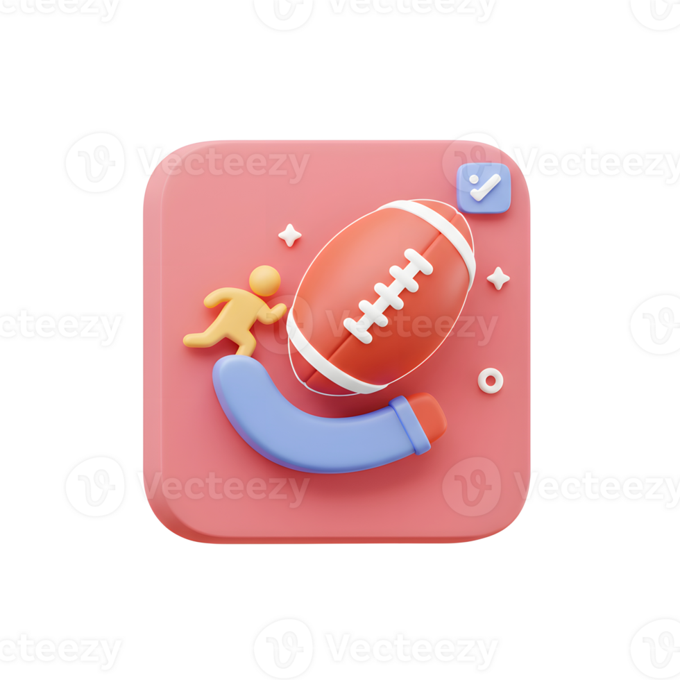 A cheerful 3D icon features a football, a running figure, and a checkmark, set against a soft pink background. Playful and inviting, it suggests successful completion of a sports-related task. Pro PNG