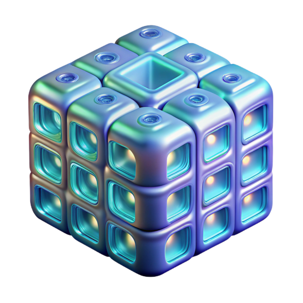 intense hypnotic Photorealistic professional render of a futuristic, holographic data cube displaying binary code with Transparent Background museum quality png
