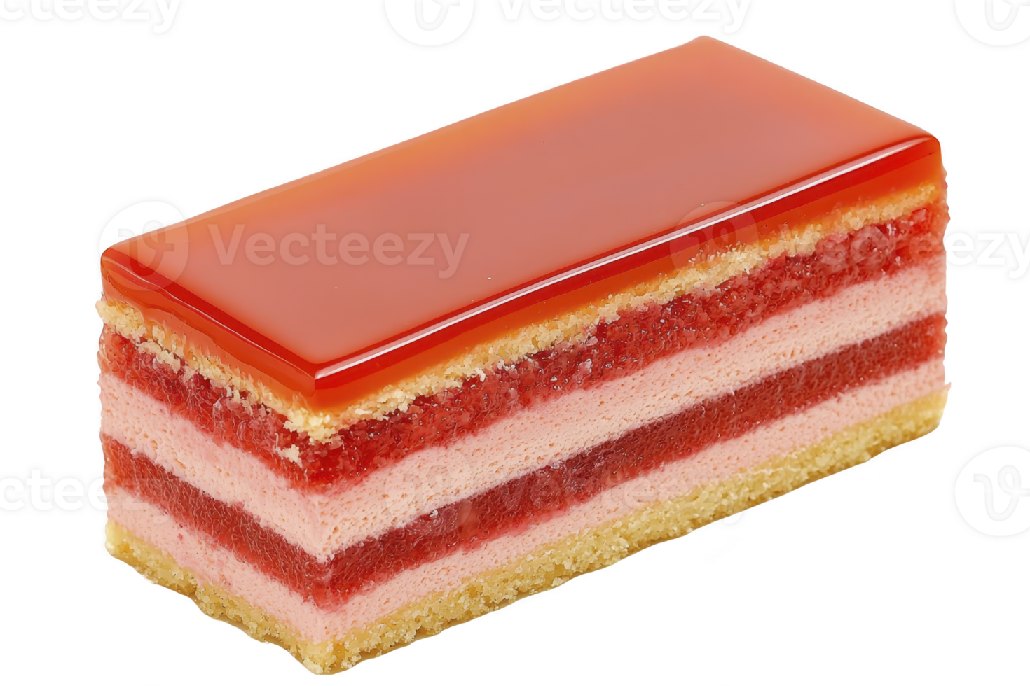 A rectangular layered cake with glossy red glaze on top, featuring alternating layers of sponge cake and pink cream, creating visually appealing dessert Pro PNG