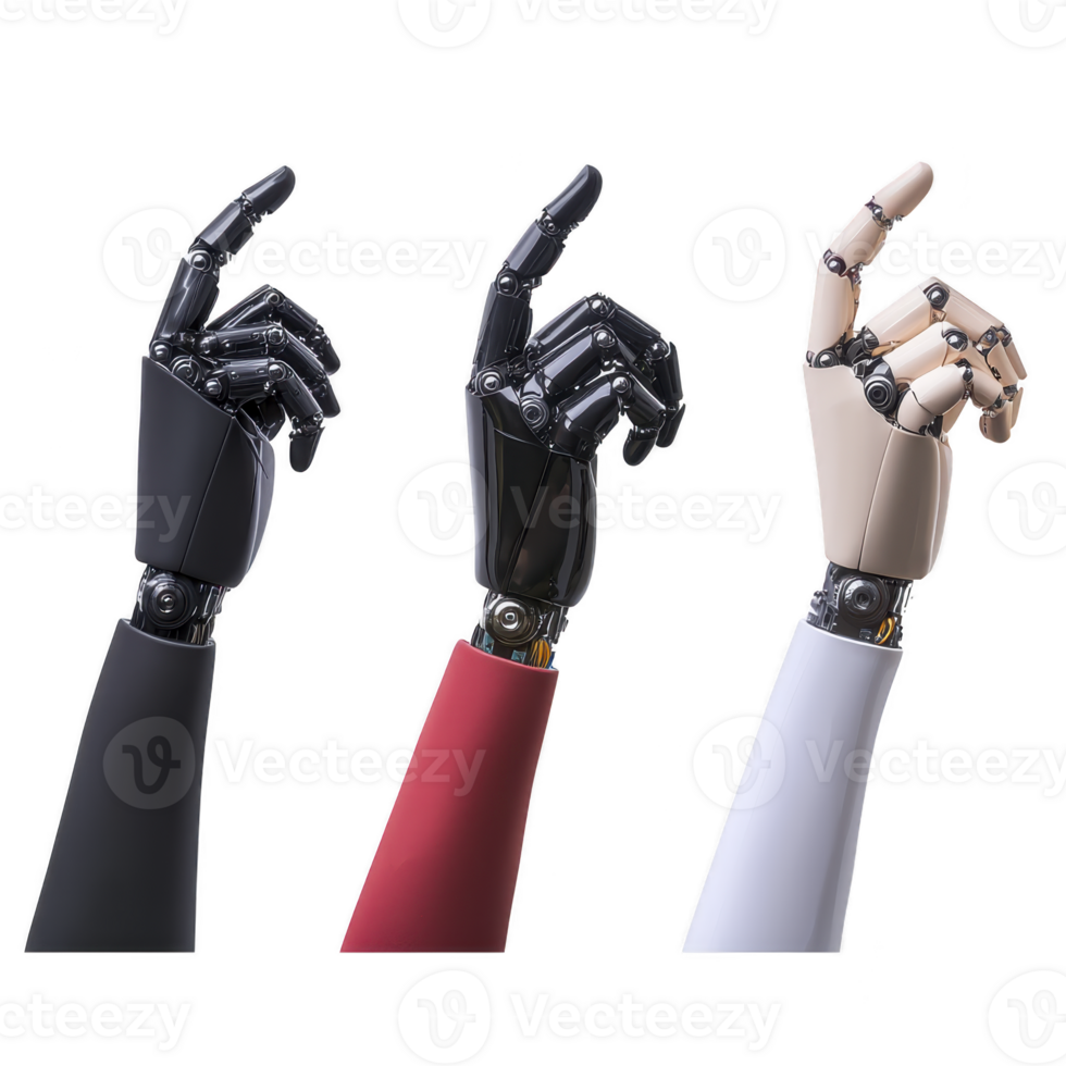 Three robotic arms in black, red, and white are shown with fingers pointing upwards, showcasing advanced technology and design. image highlights innovation in robotics and artificial intelligence Pro PNG