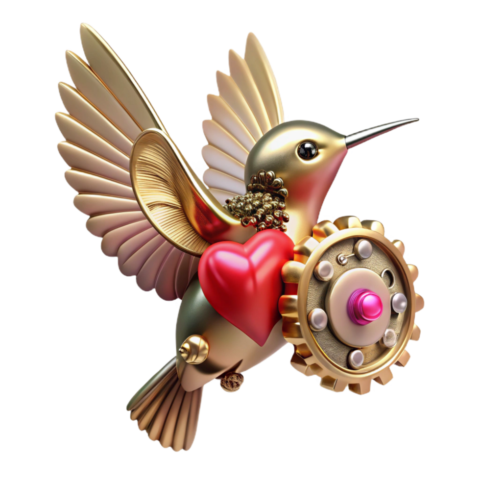 alluring energetic geometric A tiny steampunk hummingbird with delicate brass wings and a ruby heart, hovering amidst gears and cogs, soft, ethereal lighting, fantasy art style 8K Free PNG