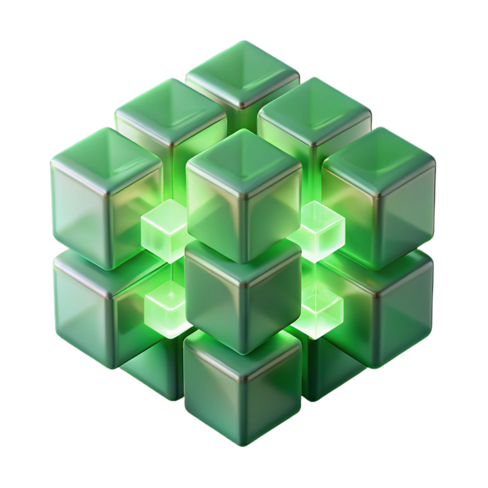 energetic radiant A cluster of translucent cubes, overlapping and intersecting, illuminated by a cool, green light. Minimalist style precision Free PNG