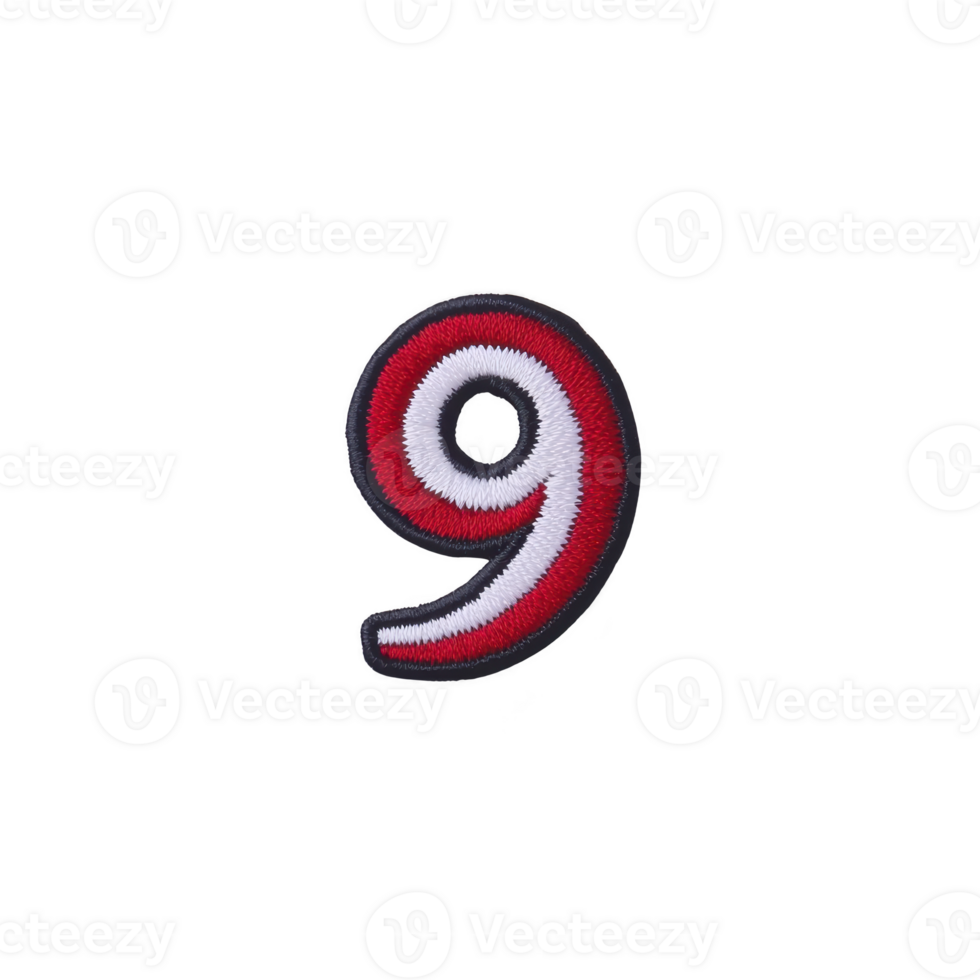 A This features red and white embroidered patch shape of number nine, set against transparency background. patch has bold, eye catching design.Red and white embroidered number nine patch Pro PNG