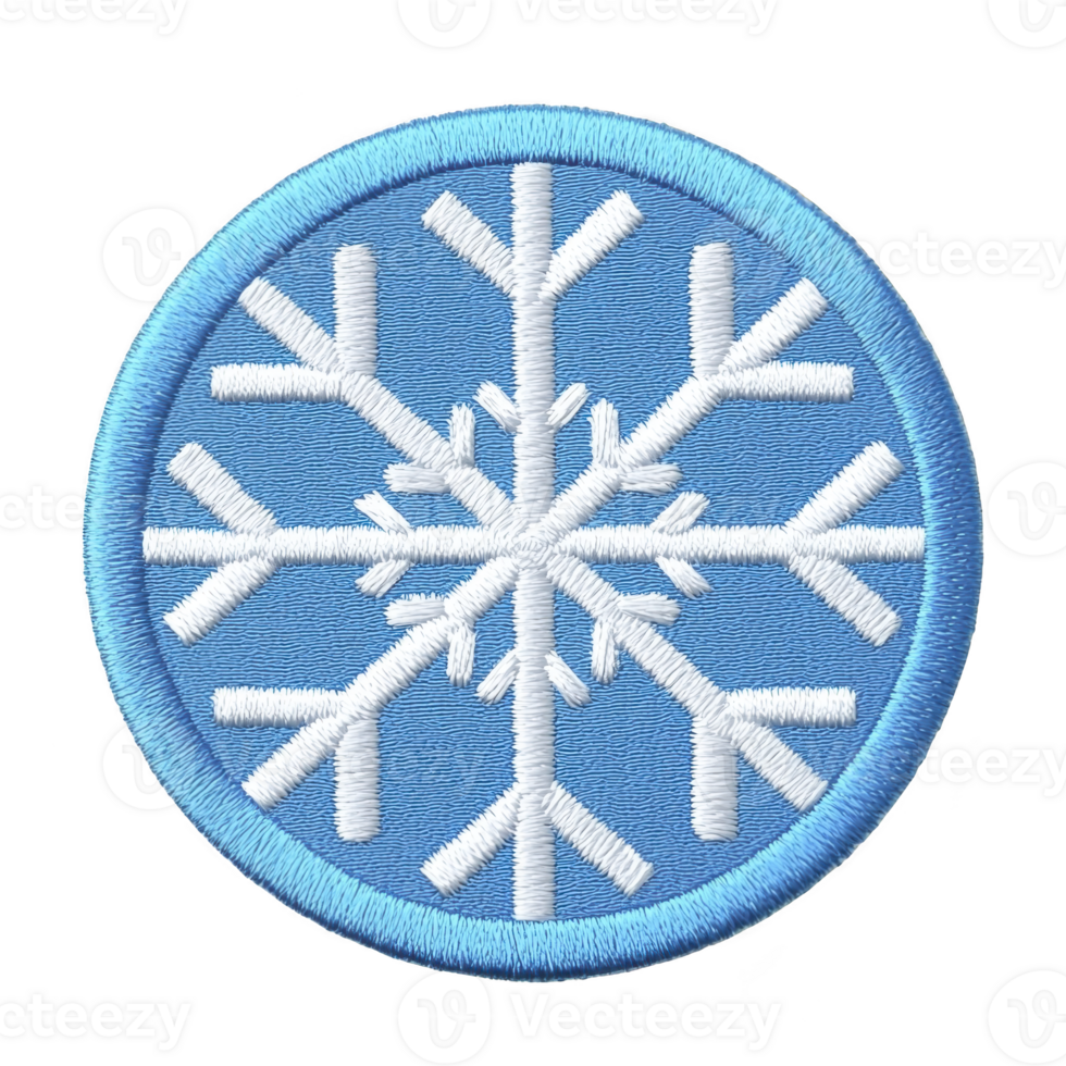 A round embroidered patch features white snowflake design on light blue background, symbolizing winter and cold weather. patch is bordered with blue edge, adding contrast and definition Pro PNG
