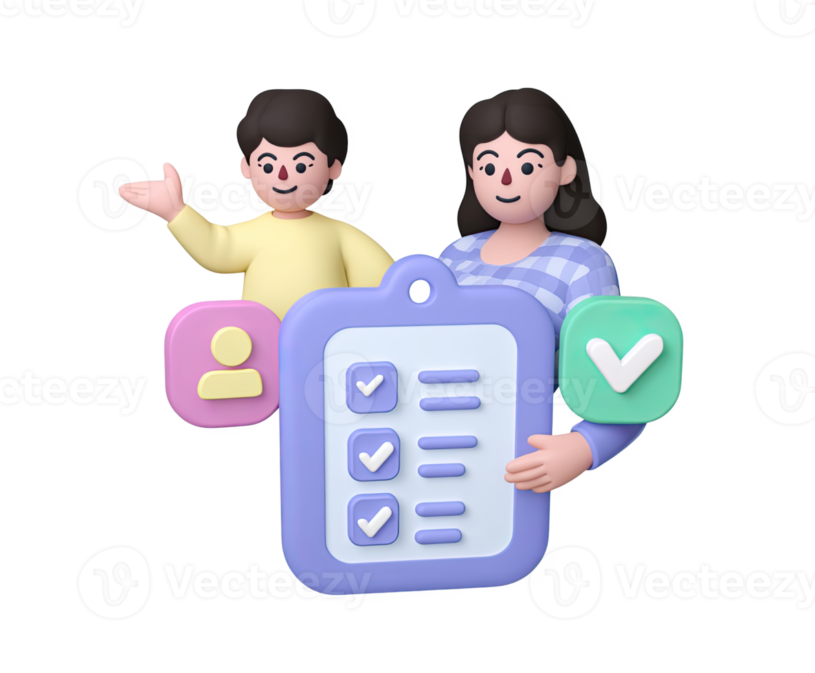 3D icon of a man and woman collaborating on a large checklist with a green checkmark, symbolizing teamwork, task completion, and project success. Isolated design. Pro PNG