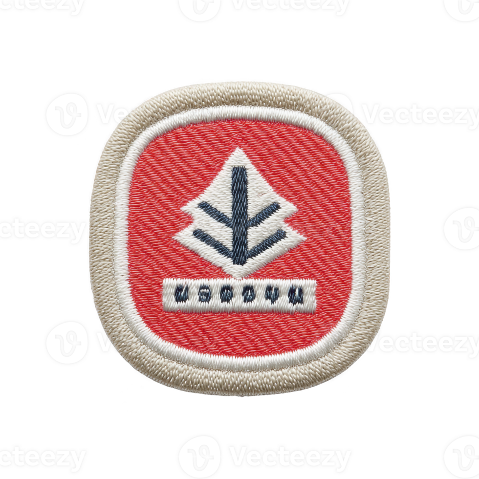 This shows red embroidered patch with white border and central design featuring stylized arrow pointing upwards. Below arrow, there is series of characters. patch has textured fabric appearance Pro PNG